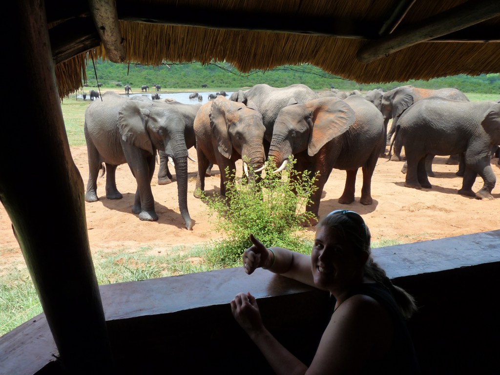 We waited until the elephant parade stopped, turned the car around and returned to camp for the show. The water hole was visible from our campsite and there was even a viewing deck we could get up onto for a better view. A 5-minute walk to the adjacent lodge and a brief stroll down a winding shady path led us straight to front-row VIP seats in the water hole’s hide.