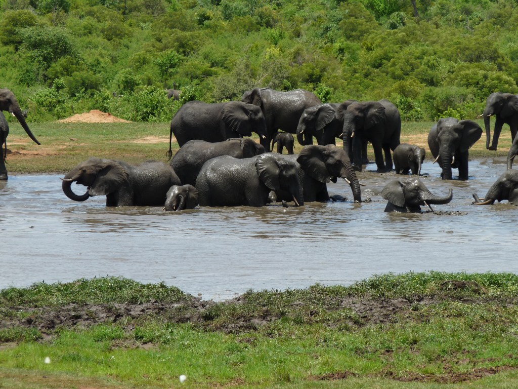 The first family of elephants was already frolicking in the water when we arrived. A baby flopped over into the water, thrust its legs into the air and sprayed water onto a nearby adult female. A teenager tried diligently to topple another adult, who eventually seemed to succumb voluntarily for a refreshing soak.