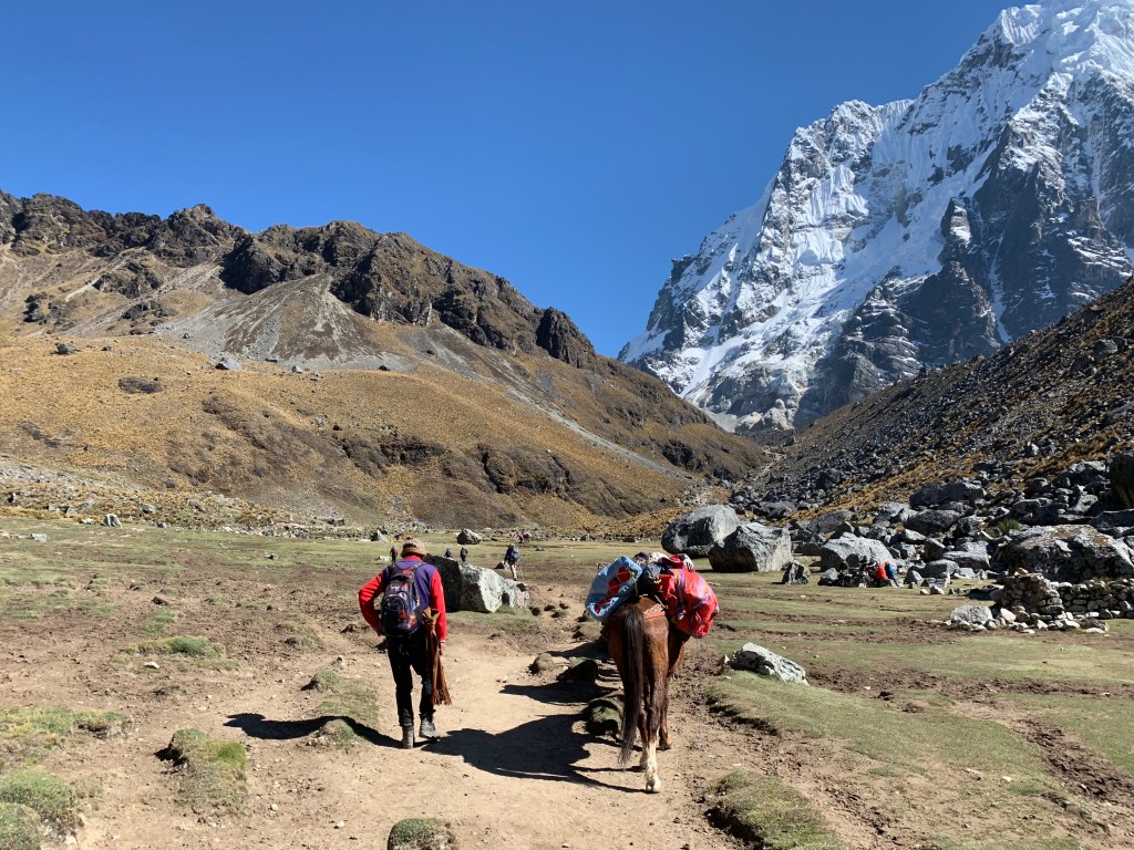 We continued on as the guided groups behind us trickled onto Salkantay Pass. We knew the groups would stay on the pass long enough for the guides to prepare some coca tea, and we were happy to descend in peace, interrupted only occasionally by porters and horses. We retrieved our bags and had lunch at a simple refuge in Wayracmachay, a hanging valley suspended just above the Amazon cloud forest. The next 3-hour stretch would be the first time we would have to carry our own bags.