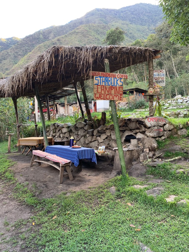 The next day we began our ascent to our first view of Machu Picchu with a walk through lush green coffee plantations. Along the way we passed a small homemade coffee stand labeled “Starbucks.” Up to now, coca tea had been the featured hot drink. Coca is the plant that cocaine is made from. Before it becomes a drug, it’s a local plant just as important to the Andean people as green tea is to the Japanese. They say coca is effective against altitude-related symptoms. You can drink it as a tea, get candy with coca in it, or chew coca leaves directly.