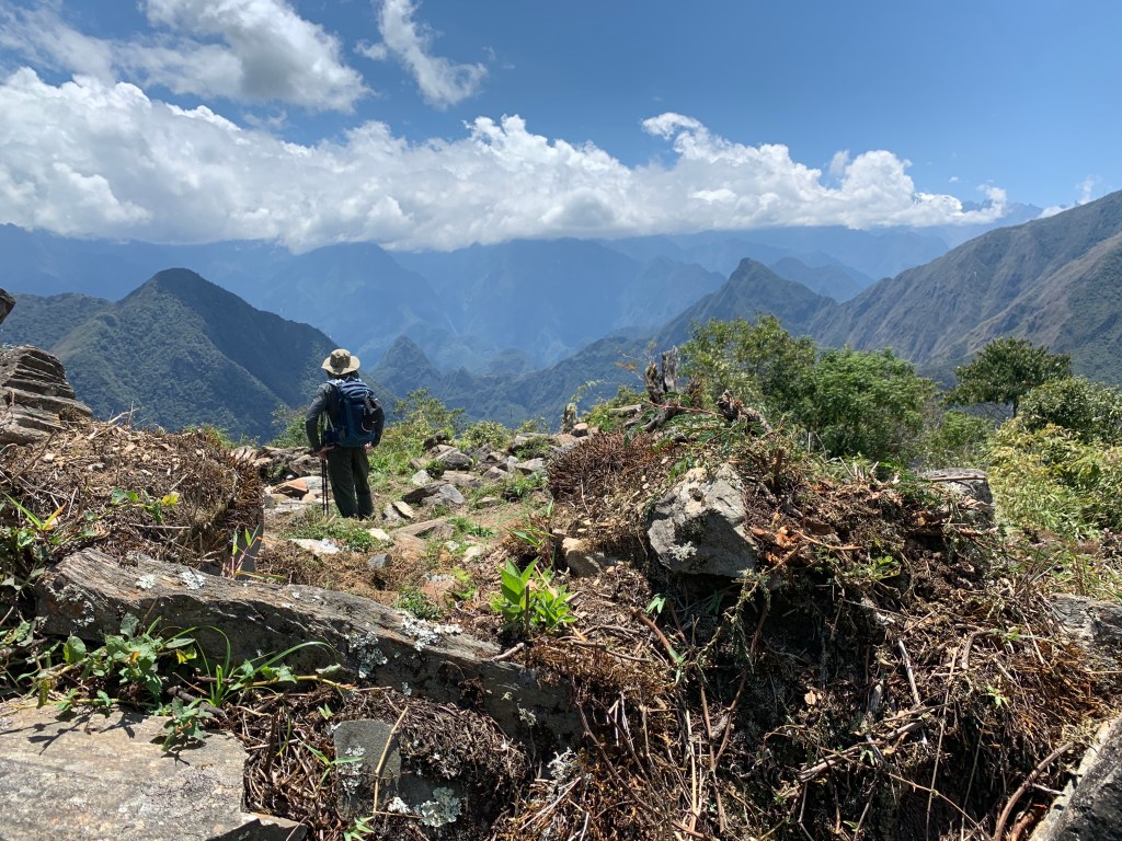 At the top of the ascent, we emerged onto a grassy perch to layered views of sharp, jungled ridges. The structures of the legendary Lost Inca City appeared in the distance, perched unassumingly on a ridgeline between two cone-shaped peaks. To the right, glaciated peaks played hide and seek behind the clouds.